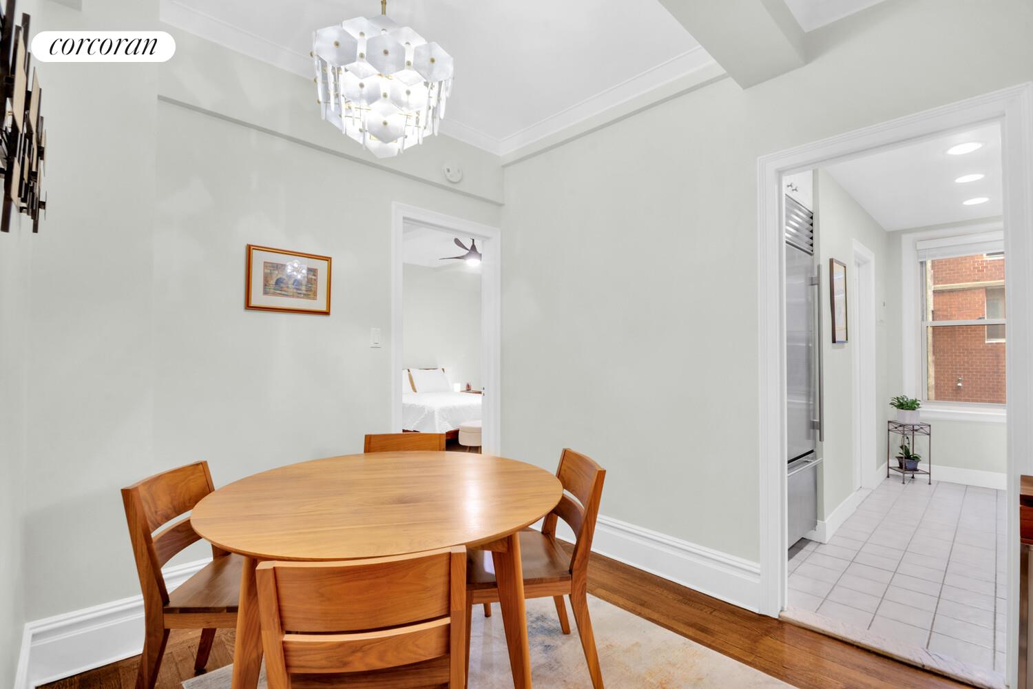 Entering 2E you will note a fastidiously maintained home with beamed ceilings over hardwood floors, decorative moldings, and designer lighting. At around 850 SF, the unit has a 20 ft long living room, separate dining area, separate kitchen, jack and jill bathroom and a graciously proportioned bedroom. The windowed kitchen has granite countertops, stainless steel appliances including a subzero refrigerator, gas range, dishwasher, and built-in microwave. The windowed bathroom has a tub, marble accents, and classic fixtures. There are two closets in the foyer, one lined with cedar, and two in the bedroom. The apartment was recently painted and skim coated, and the electrical service was upgraded.