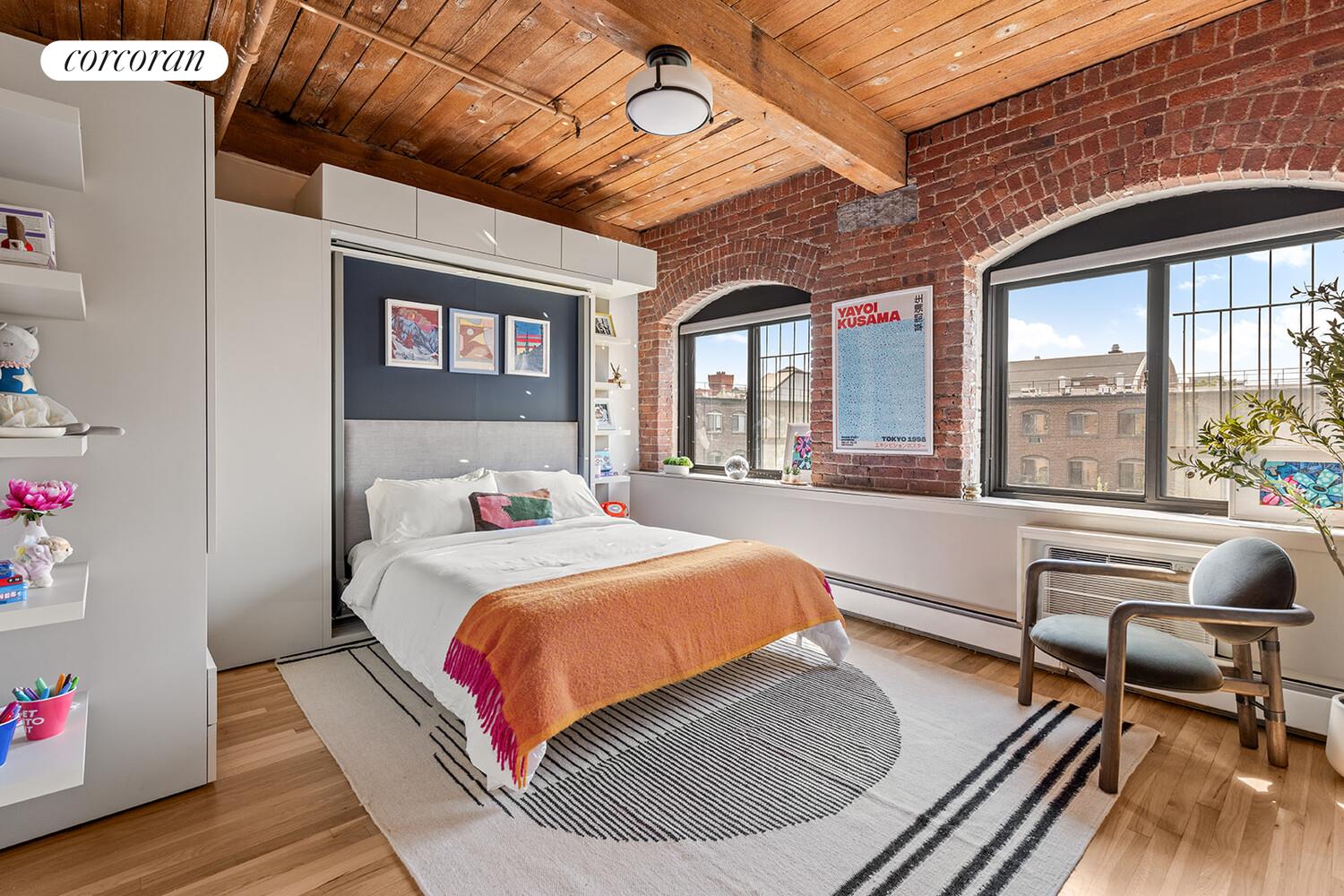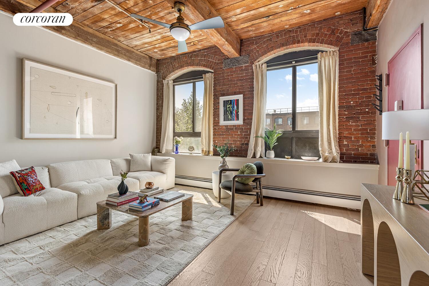 Located on 12th Street in the heart of the South Slope lies the Ansonia court, originally a turn of the century brick and timber clock factory and now a spectacular loft building with cult status! This pet friendly co op is the anchor of the South Slope built in a European style with a interior lush courtyard complete with cherry trees, a serene water feature, and perennial plantings. This oversized 2 bedroom (convertible 3), 1.5 bath duplex is laid out graciously with living, dining, kitchen and powder room on the lower level and two large bedrooms, full bathroom and full sized washer dryer on the upper level. The open kitchen with shaker style mil-work and stunning black absolute marble opens onto the sunny dining area complete over sized factory windows, exposed brick and original wood beams.