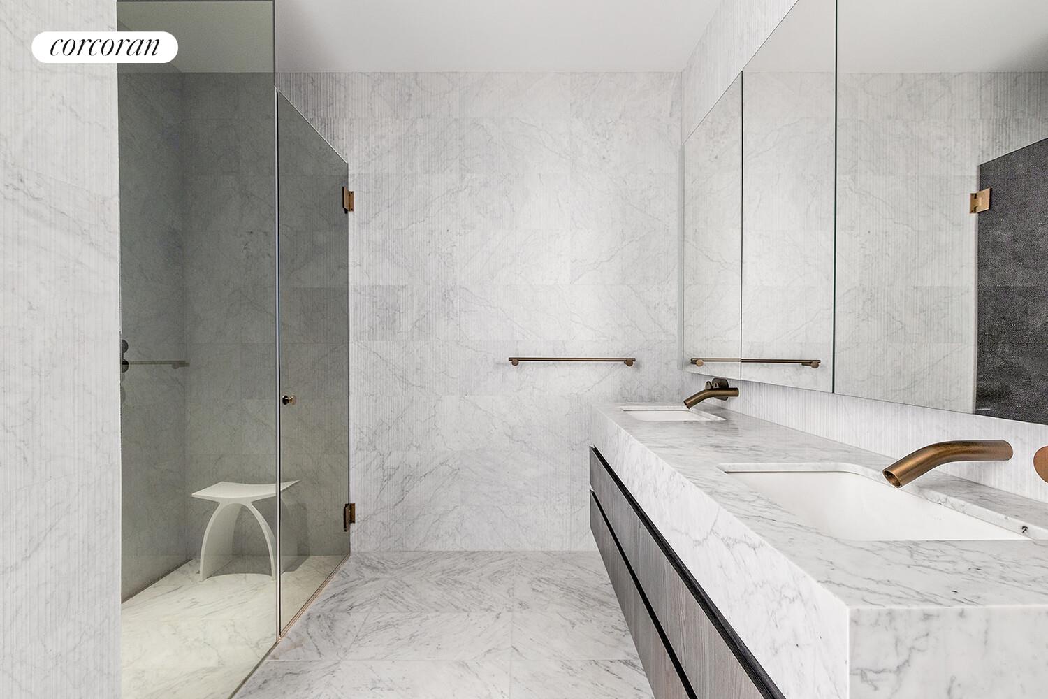 The secondary bedroom includes its own marble-clad bathroom with a deep soaking tub and custom millwork. Throughout the residence, enjoy wide-plank white oak flooring, oil-rubbed bronze fixtures, and a cohesive, elevated aesthetic.