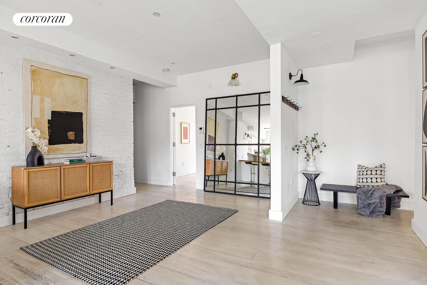 A large utility closet includes your own Bosch stacked washer & dryer; Bosch tankless water heater and boiler along with abundant storage space. This gorgeous unit also has a Nest system for your Central Air and Heating; overhead stainless steel ceiling fans and an exposed and painted brick wall.