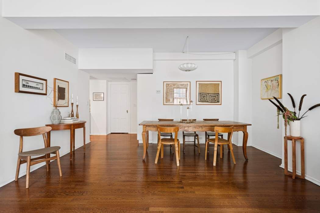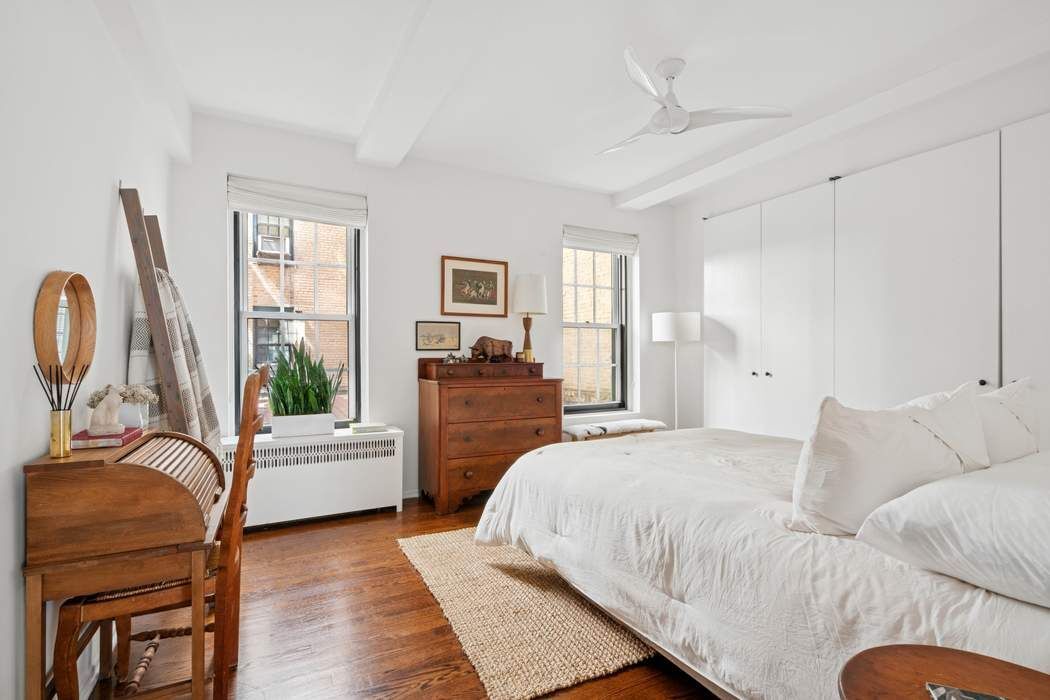 Residence 2J is distinguished by beautiful hardwood floors, large windows, and a split-bedroom layout that creates a private sanctuary. An expansive great room accommodates both living and dining with ease and captures picturesque southern views over the storybook charm of Washington Mews. The primary bedroom faces a quiet courtyard, creating a restful retreat, and includes an ensuite bath finished with classic subway tiling. The second bedroom, also overlooking the Mews, is generously proportioned to accommodate a king-size bed. A renovated second bathroom with a glass-enclosed shower is conveniently situated off the hall. The kitchen is efficient yet elegant, appointed with Viking and Miele appliances, an integrated refrigerator, streamlined cabinetry, and white quartz countertops. Central air conditioning provides the home with year-round comfort.