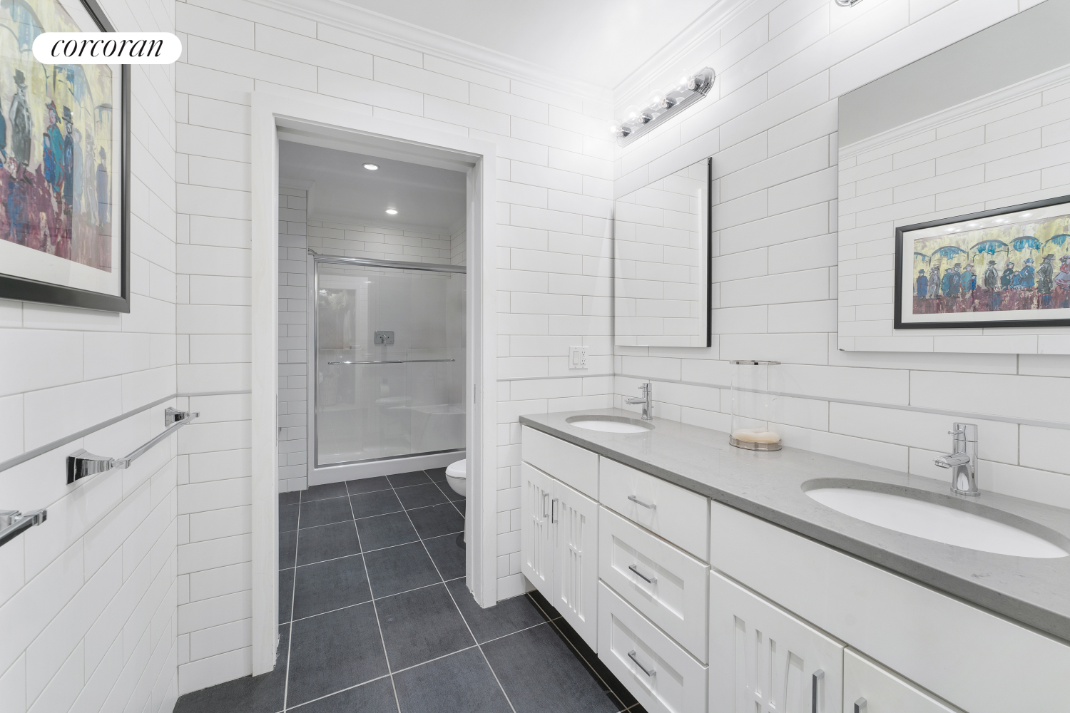 The primary bedroom is an immense serene sanctuary with Eastern exposure, flooding the room with beautiful morning light. Overlooking the trees on West Broadway through three huge windows, this quiet retreat offers enough space for an additional office area and TV setup. The en-suite bathroom is a luxurious escape, featuring grey and white quartz countertops, shaker cabinets, stainless faucets, a double vanity sink, porcelain tile flooring, a deep soaking tub with polished stainless fixtures, a stall shower with a modern glass door, and a towel warming bar. The massive walk-in closet with custom shelving provides ample storage space.