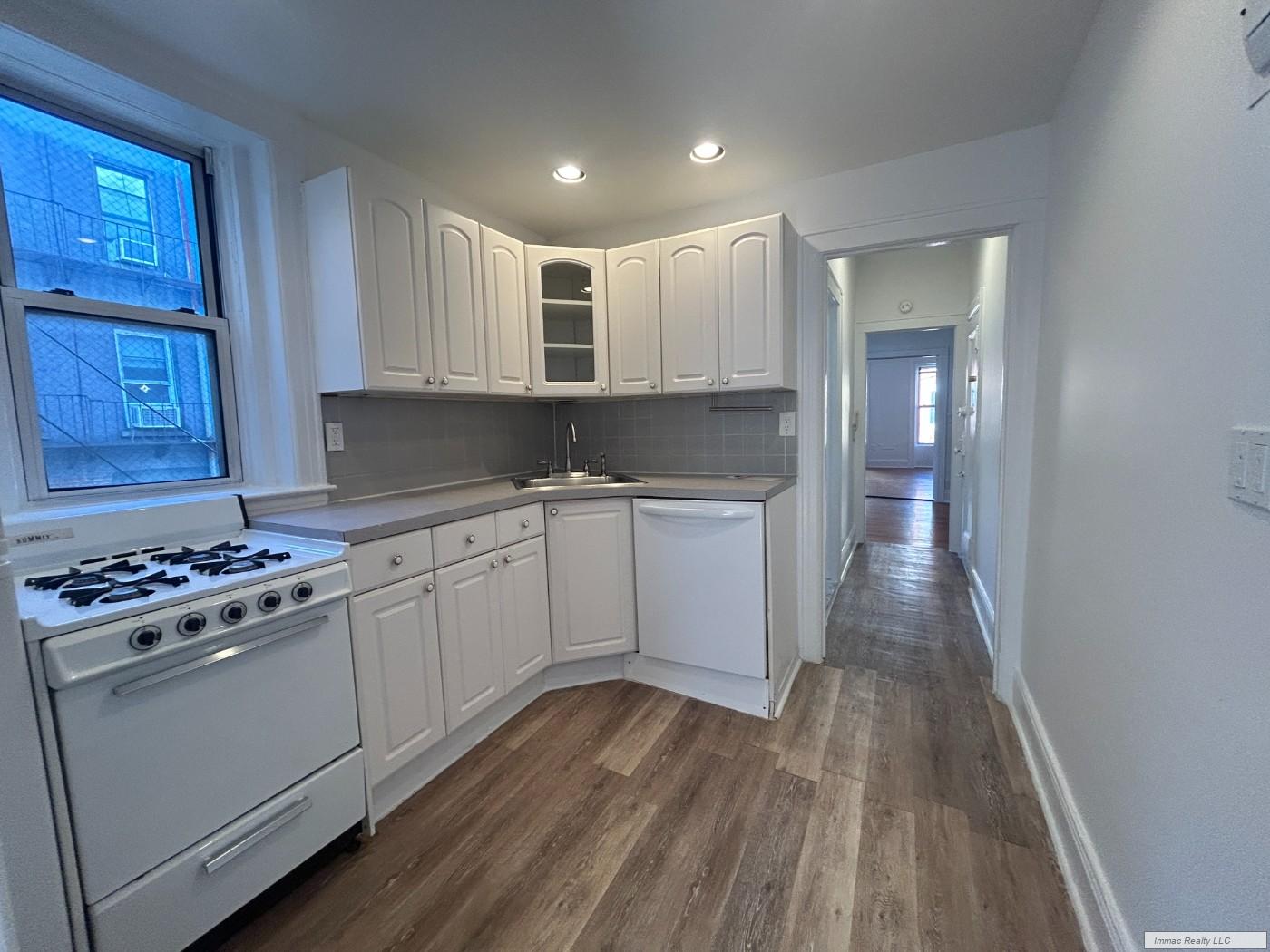 large separate kitchen with dishwasher, window, great counter space, lots of cabinets and window and room for small table.