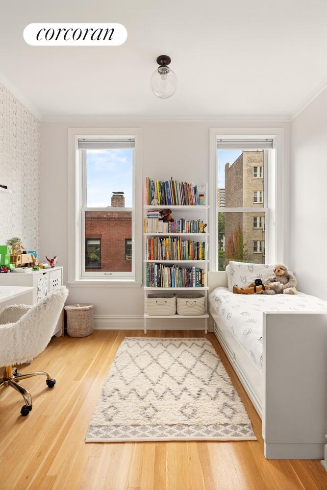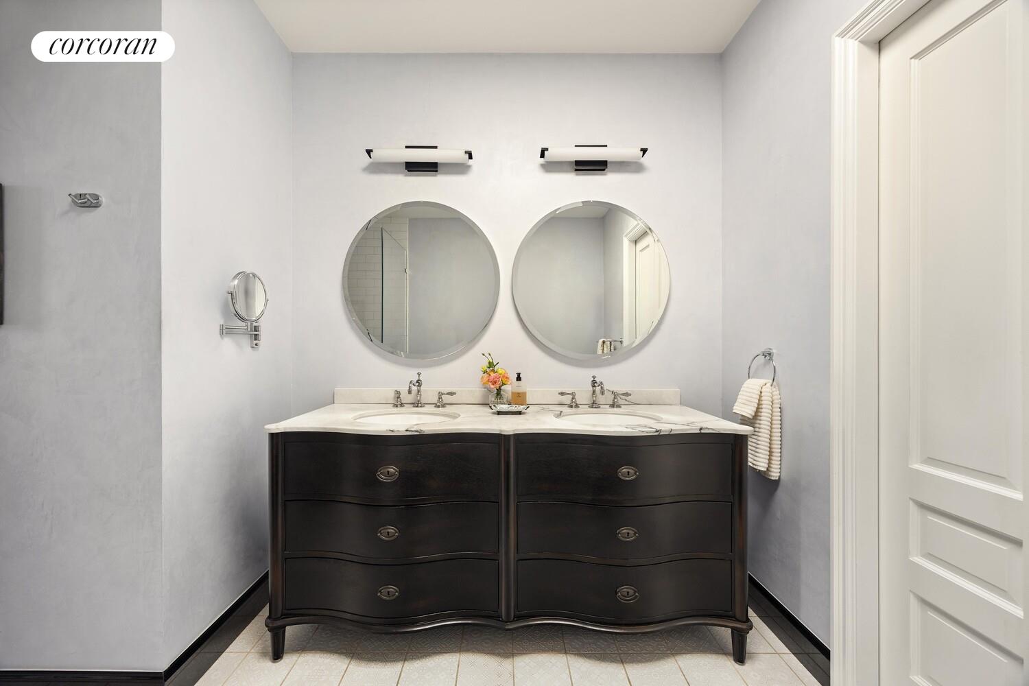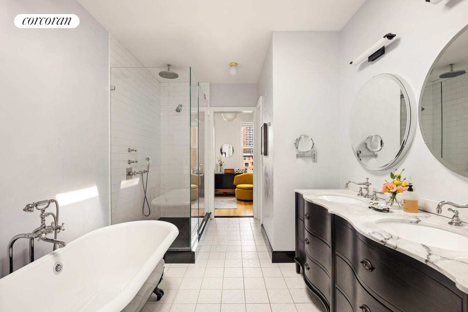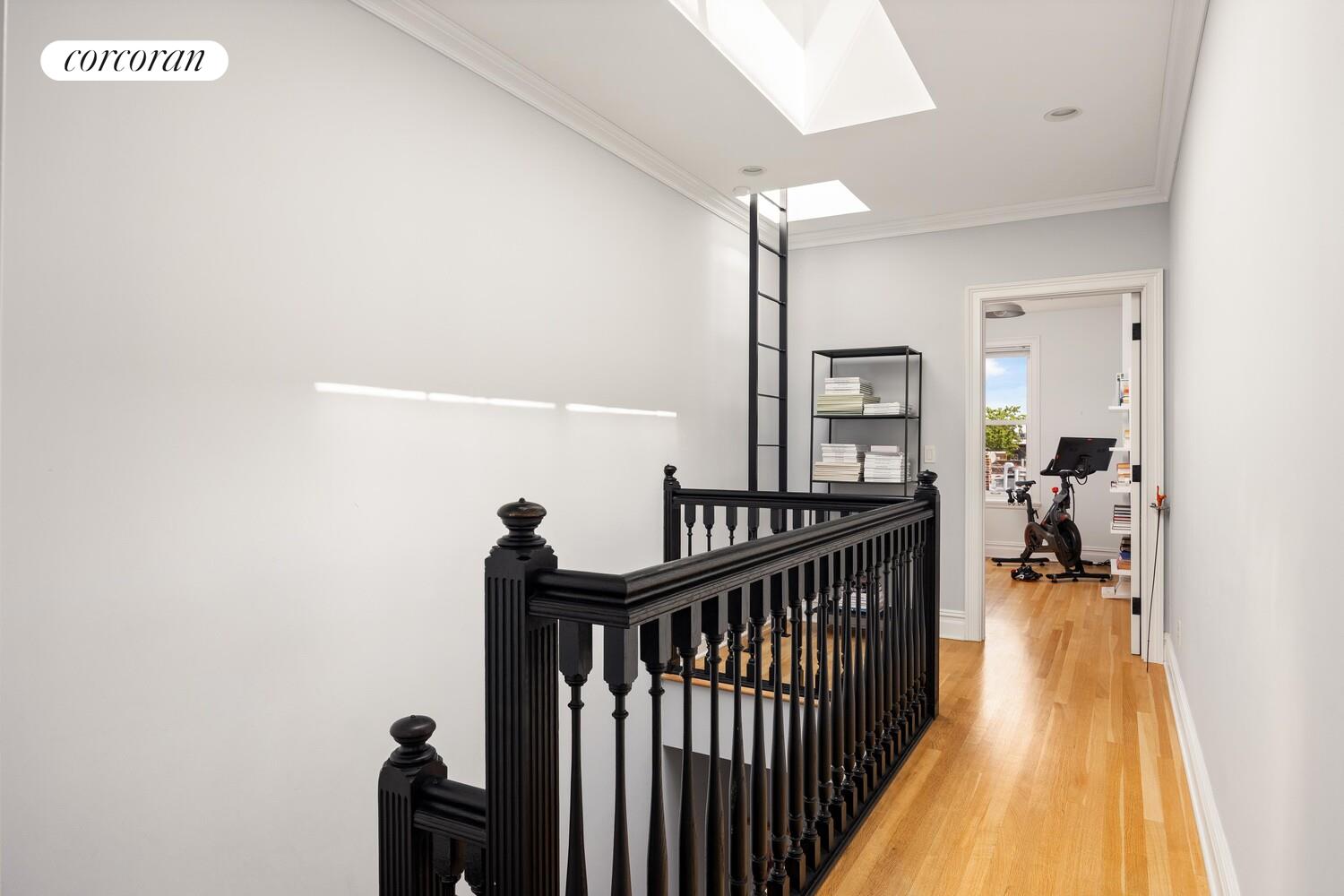 Occupying the entire top floor, the primary suite offers a peaceful, sun-drenched sanctuary. The oversized bedroom is surrounded by treetop views through three generous windows. A walk-in closet outfitted with California Closets greets you upon entry to the spa-like bath with large skylight allowing an abundance of natural light. Here, Venetian plaster walls, a cast-iron freestanding soaking tub, large glass-enclosed shower, Restoration Hardware wood double vanity, and Newport Brass fixtures create a luxurious experience. A second, expansive walk-in closet & dressing room is tucked behind the bath and also features custom closet systems and abundant natural light. To top it off there is bonus windowed room on this floor used as a home gym or can become a private study.