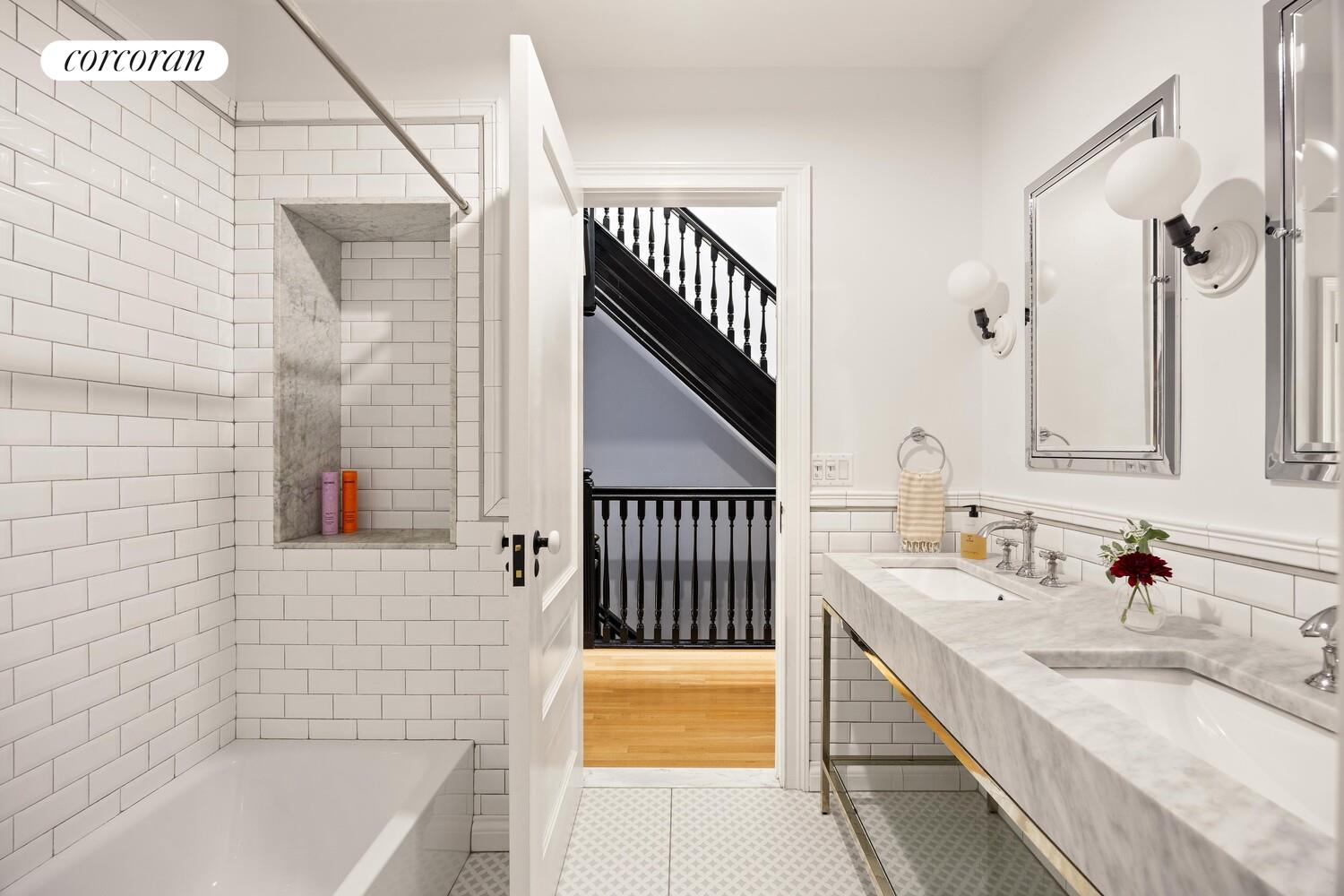 Three well-proportioned bedrooms and two full bathrooms comprise the third level. Another grand, west-facing bedroom mirrors the one below and includes its own en suite bath with shower. Two additional bedrooms are located toward the rear of the home and share a beautifully appointed bathroom featuring a double vanity with marble countertops, a deep soaking tub, and a private water closet-perfectly designed for both privacy and convenience. Also located is a large closet with oversized washer/dryer and plenty of space for lined storage.