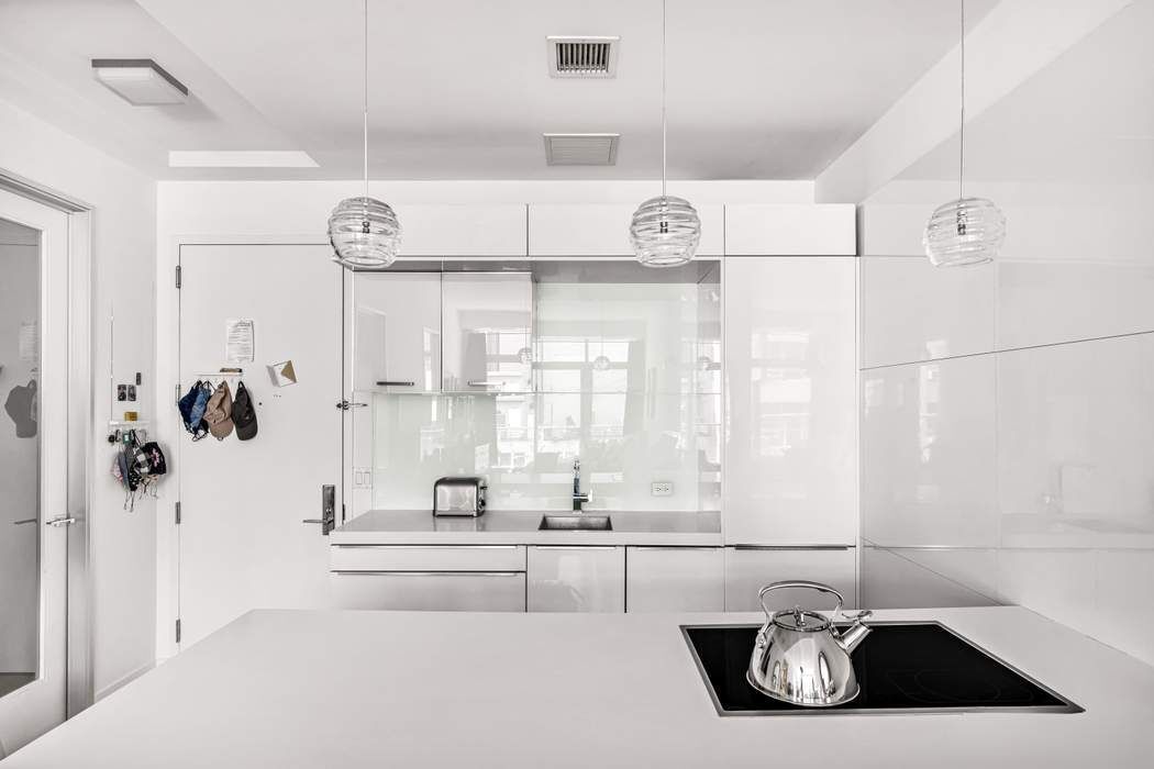 The Italian designed Open Kitchen with Island features White Blizzard Caesar Stone Countertops, Glass Back Splash, Gagganau Ceran Electric Cook Top with sensor touch controls, Miele Speed Oven with integrated Convection/Microwave combination, Miele Optima Dishwasher with integrated face panel, Liebherr Refrigerator/Freezer with ice maker and a Stainless Steel rectangular under mount sink with Newform Faucet. Custom, Modern Marble tiled Bathroom en-suite (fittings by Newform, Duravit Toilet) has a separate Deep Soaking Tub and Glass Enclosed Rain Shower.