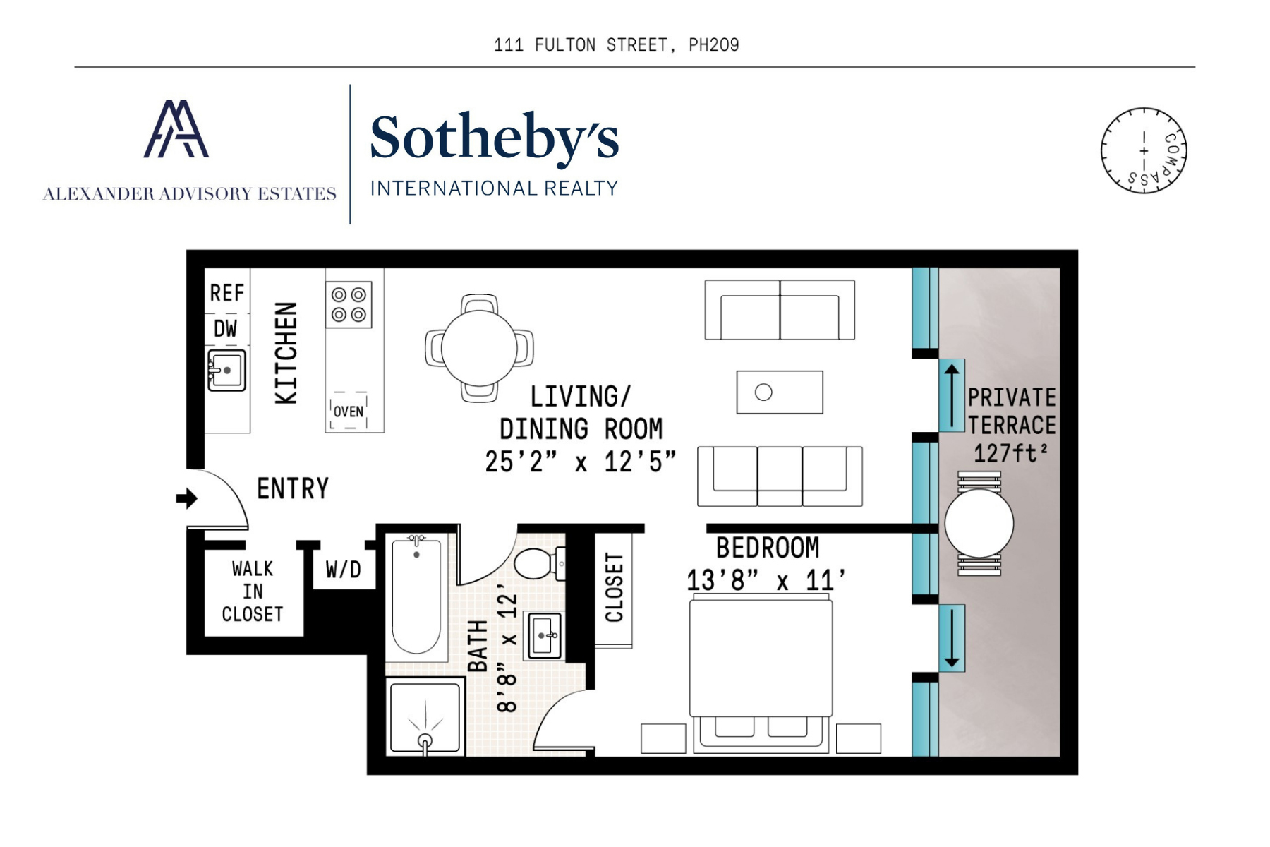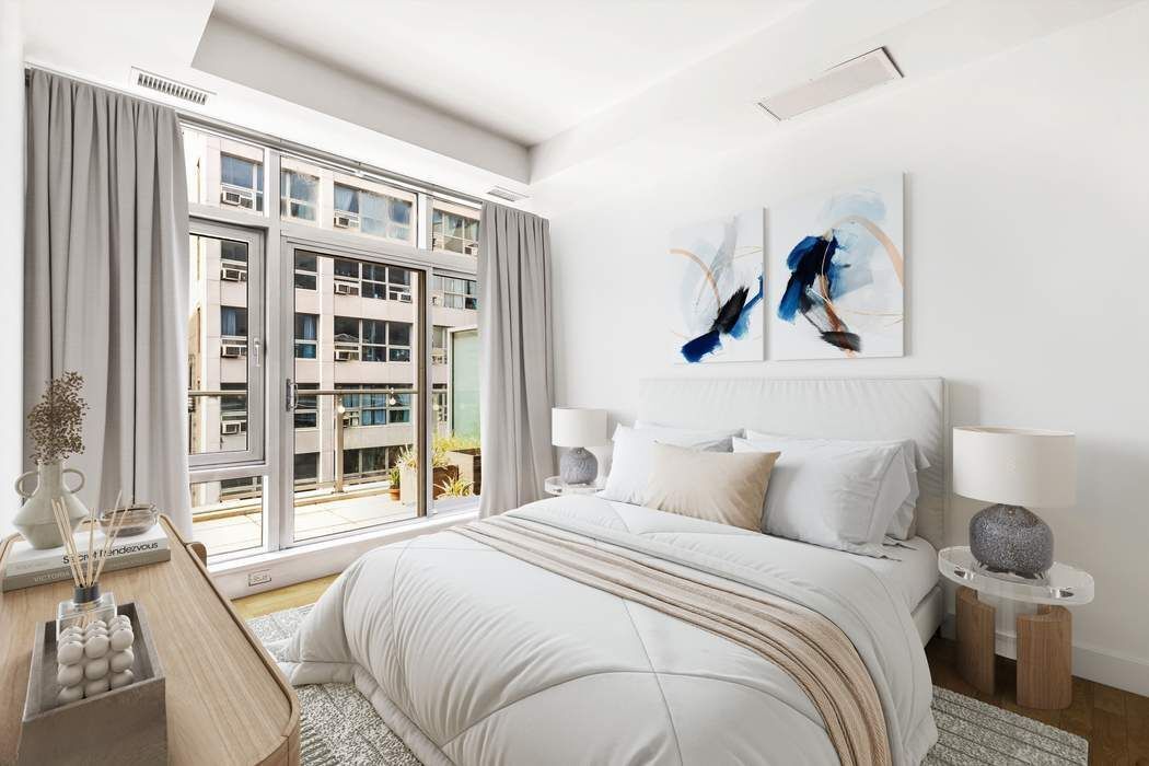 Nested high up in the building, PH 209 offers everything you would want in a NYC apartment. The sun flooded 808+/- sqft 1 bedroom features 11.5’ Ceilings with Floor-to-ceiling windows facing south which then opens to a (127+/- sqft) private terrace.
