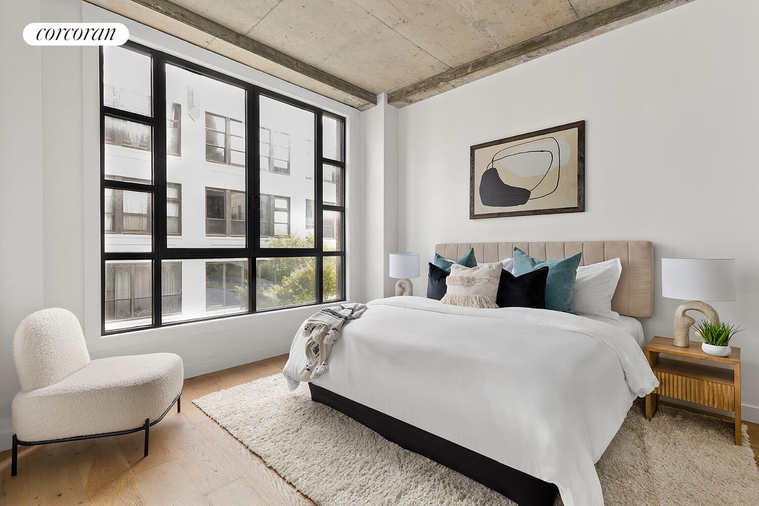 Contemporary finishes define the home, from wide-plank oak floors and exposed concrete ceilings to expansive Schuco casement oversized windows that fill the space with natural light. Modern essentials include multi-zone heating and cooling, and an in-unit washer/dryer.