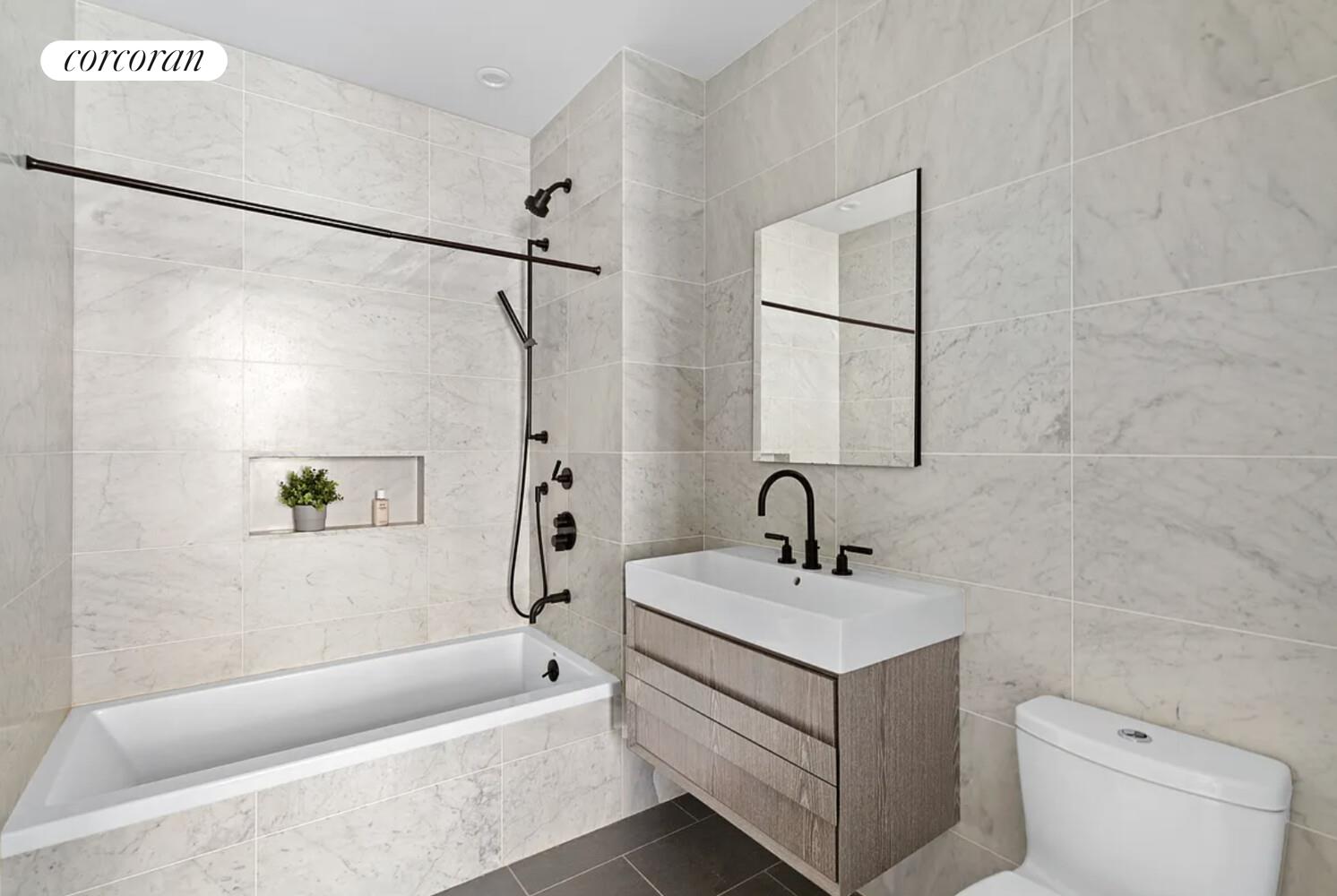 The open-concept layout creates a natural flow between the living, dining, and kitchen areas. The chef's kitchen is equipped with Bianco Puro stone countertops and backsplashes, custom matte black cabinetry with Fenix finish, and a premium suite of appliances by Sub-Zero, Liebherr, and Bosch. The living area extends seamlessly to the private balcony, for morning coffee or evening unwinding. Enter the spacious bedroom featuring a walk-in closet, while the spa-inspired bathroom showcases marble finishes, radiant heated floors, a floating vanity and a deep soaking tub.