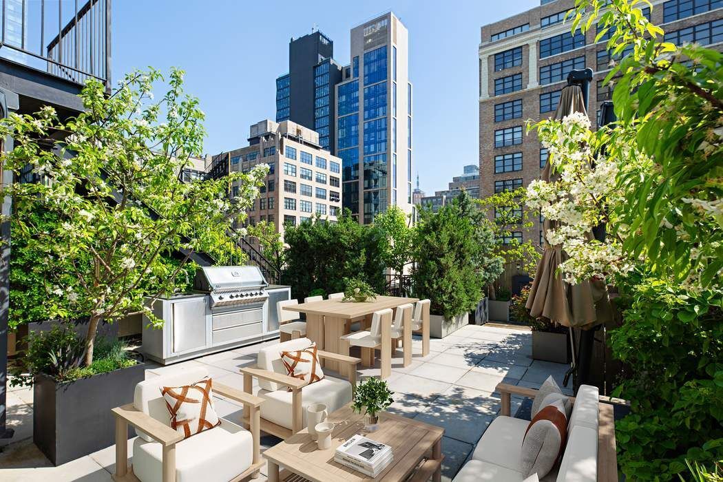 Sun-Filled Terrace Lover’s Dream: A Garden Oasis - ONE, none or either? This one-of-a-kind penthouse retreat is truly divine. In exquisite mint-condition, the crowning jewel of this very glamorous 4,700 square foot duplex condominium residence is its nearly 2,500-square-foot landscaped terrace, making it ideal for seamless indoor-outdoor living. The expansive wraparound terrace is a true extension of the living space and features multiple alfresco dining and casual seating areas, a pergola, a fully-equipped outdoor kitchen, and a greenhouse solarium. Flooded with natural light and with sweeping, panoramic views of the Hudson River and Freedom Tower during the day and of the shimmering city lights at night, this apartment has a truly cosmopolitan sensibility. Upon entry, a private keyed elevator opens directly into a spectacular Great room with distinct areas for dining and seating. Flooded with natural light, this space features soaring 12-foot beamed ceilings, oversized windows, and wide-plank oak flooring, creating a sense of lofty elegance. The corner Living Room offers breathtaking views of the Hudson River and western light. Beyond, a striking floating metal staircase defines the elegant Dining Room. Completing this magnificent room is a chef’s Kitchen, outfitted with custom oak cabinetry paired with luminous Luce di Luna stone countertops. Framed by spectacular southern and western outlooks, the Kitchen features a stylish banquette for casual dining and state-of-the-art appliances by Wolf, Miele, and Liebherr. Nearby, a copious walk-in pantry offers abundant storage. Also on this level, tucked away behind iron and glass doors are private quarters that incorporate three Bedroom, each with an ensuite bath. The Primary Suite is a luxurious retreat, featuring a custom-fitted dressing closet and a spa-like bathroom with radiant-heated Belgian bluestone floors, a separate soaking tub, glass-enclosed shower, and Carrara marble double vanity. There are two additional Bedrooms, each with an ensuite bath and very ample closets. A Laundry Room and Powder Room complete this level. Above, there is one additional elegantly-sized Bedroom with an ensuite bathroom, and a separate Library. In the Library, floor-to-ceiling French doors open onto the expansive 2,735-square-foot landscaped terrace, a total sanctuary in the sky. One of just six exclusive residences in a boutique building, this magnificent duplex offers unparalleled privacy, elegance, and light. Additional features include a Crestron Home Automation System, multi-zone HVAC, an integrated sound system and a virtual doorman.