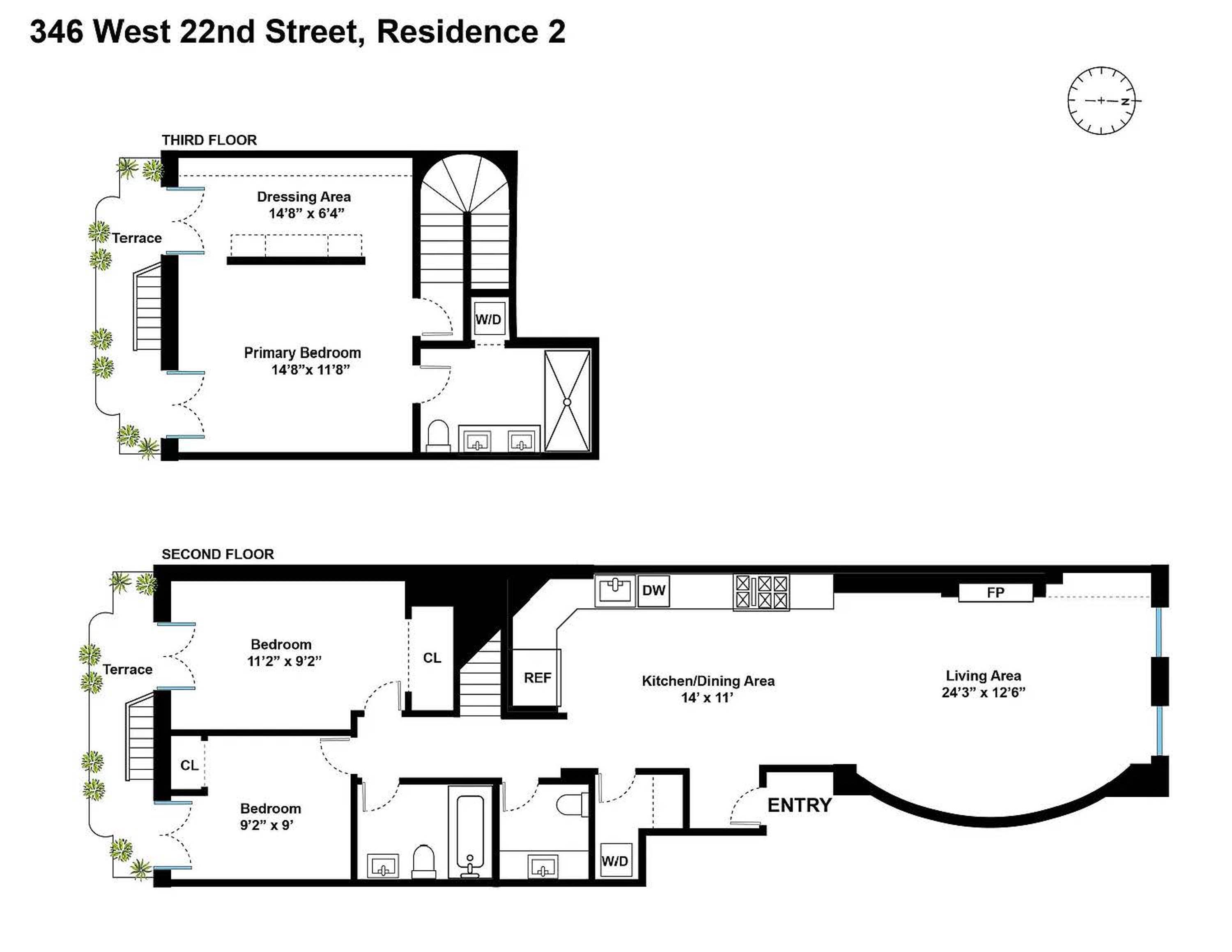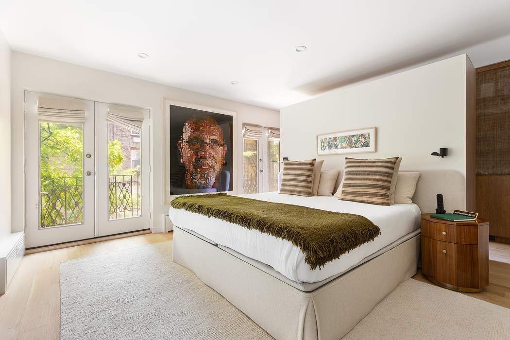 Two bedrooms down the hall with their New Orleans-style balcony overlook the lush brownstone gardens. Up the sensuous stairway, the primary bedroom along with its en-suite bath, walk-through wardrobe and French doors with additional balcony makes for an ideal separation of public & private space.