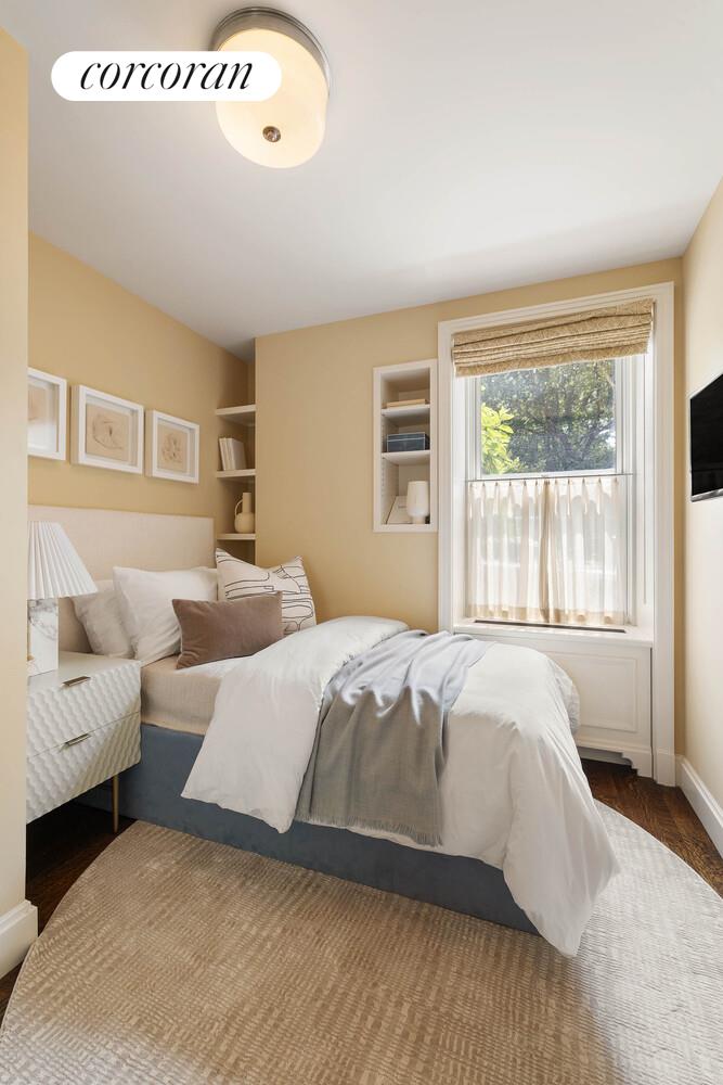 The primary suite is a light-filled, airy retreat facing south, offering warmth and sunlight throughout the day. Thoughtfully appointed with custom millwork, a built-in storage closet, and generous proportions, it provides a serene and elegant escape. The luxurious en-suite bath is clad in floor-to-ceiling marble and features a double vanity, deep soaking tub, oversized rain shower, and timeless brass fixtures.