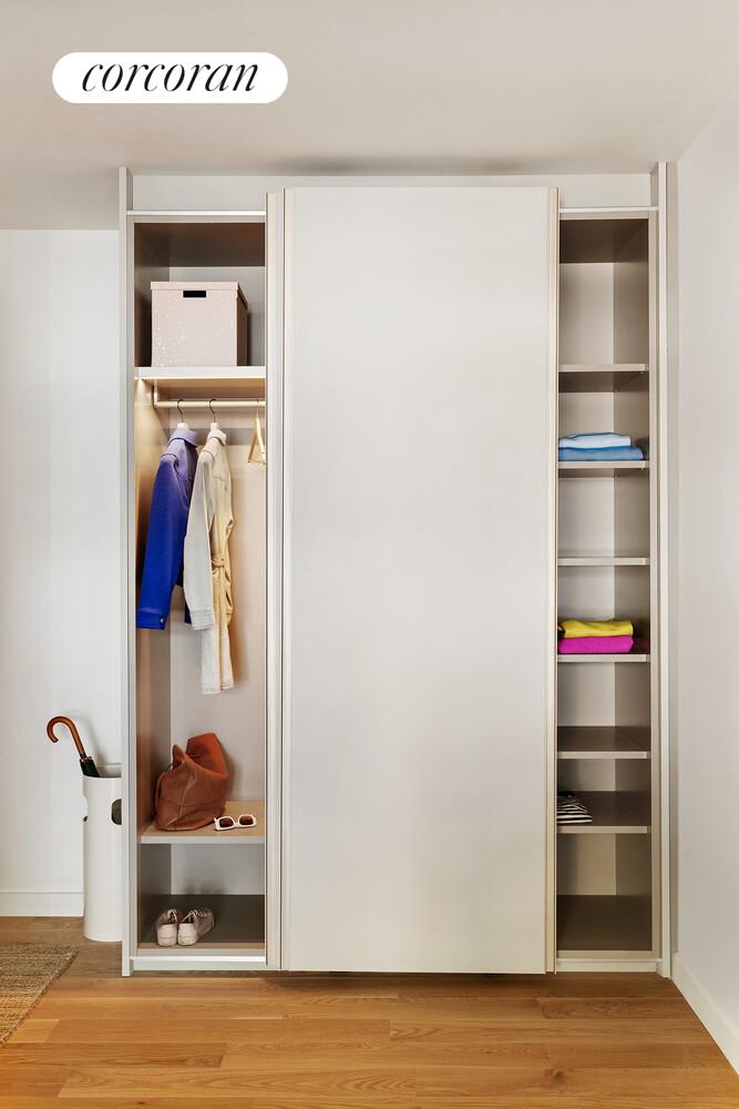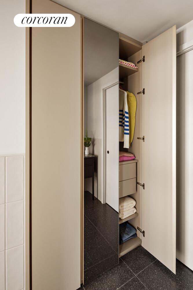 Residence 523 is a thoughtfully designed 670 sq. ft. one-bedroom home with bright western exposure, filling the space with natural light throughout the day. The entry foyer leads to a sleek, open kitchen featuring dramatic marble countertops and backsplashes, custom cabinetry with ample storage, and premium appliances by Miele and Bosch. The king-size primary bedroom offers a serene retreat, complete with a beautifully appointed en-suite bathroom showcasing grey terrazzo flooring, soft grey ceramic wall tiles, a honed grey marble countertop, a custom matte black vanity, and matte black fixtures by Rohl. Additional features include an in-unit Bosch washer and dryer, central air conditioning, motorized roller shades, and private storage-making this home a refined and tranquil urban sanctuary.