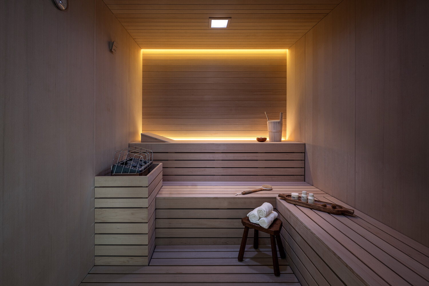 A hallway from the main living area provides access to the powder room and primary and secondary bedroom suites. The powder room is finished with a pedestal vanity in honed African St. Laurent stone and chamfered edges, a hidden mirror, and white maple-clad walls.