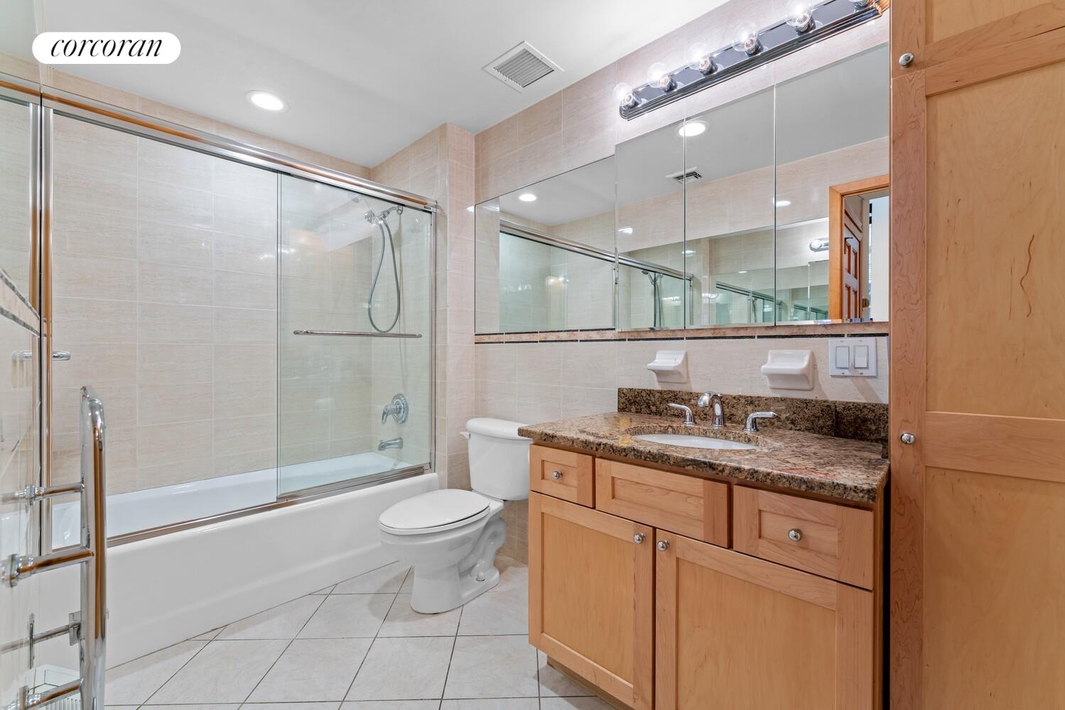 The primary suite is a private retreat with soaring ceilings, leafy western views, and a custom walk-in closet designed for generous storage. Its en-suite bathroom is spacious and well-appointed, featuring a granite-topped vanity with abundant mirrored cabinetry, a full tub-shower combination, and warm natural tile that creates a spa-like atmosphere. The second bedroom is equally impressive in scale, with oversized windows that bring in natural light and highlight the loft's dramatic ceiling height. Conveniently positioned off the hallway for guest access, the second bathroom is finished in a striking blue tile palette and includes a glass-enclosed stall shower, offering both style and functionality.