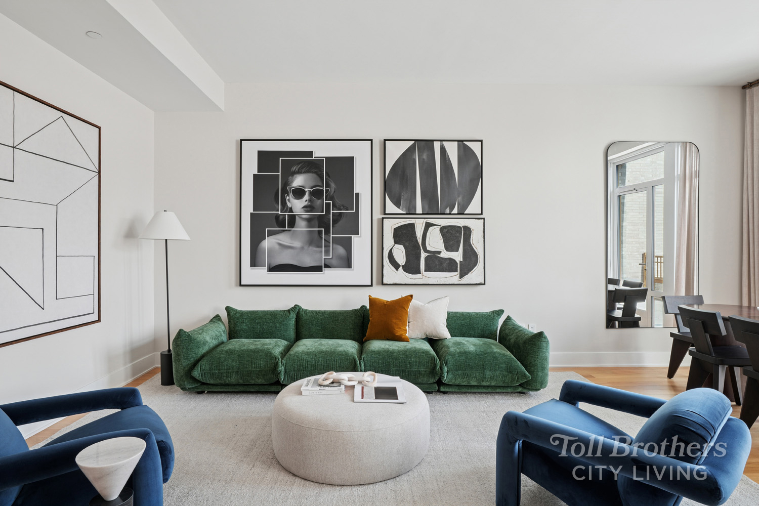 Encompassing 1616 SF, Residence 12B is a unique 3-bedroom/3-bath home with an appealing open layout and ceilings up to 10’. A gracious entry hall leads to spacious living area which opens to a terrace with southern and western exposures, overlooking Broadway. The primary suite has the same dual exposures, and generous closet space. The luxurious en-suite primary bathroom is clad in polished Bianco Estremoz marble and features Calacatta Delicato marble countertops and a custom Poliform vanity with ample storage. Each additional bathroom features a custom Poliform vanity topped with quartz, Porcelanosa tiled walls, and a porcelain mosaic tile floor.