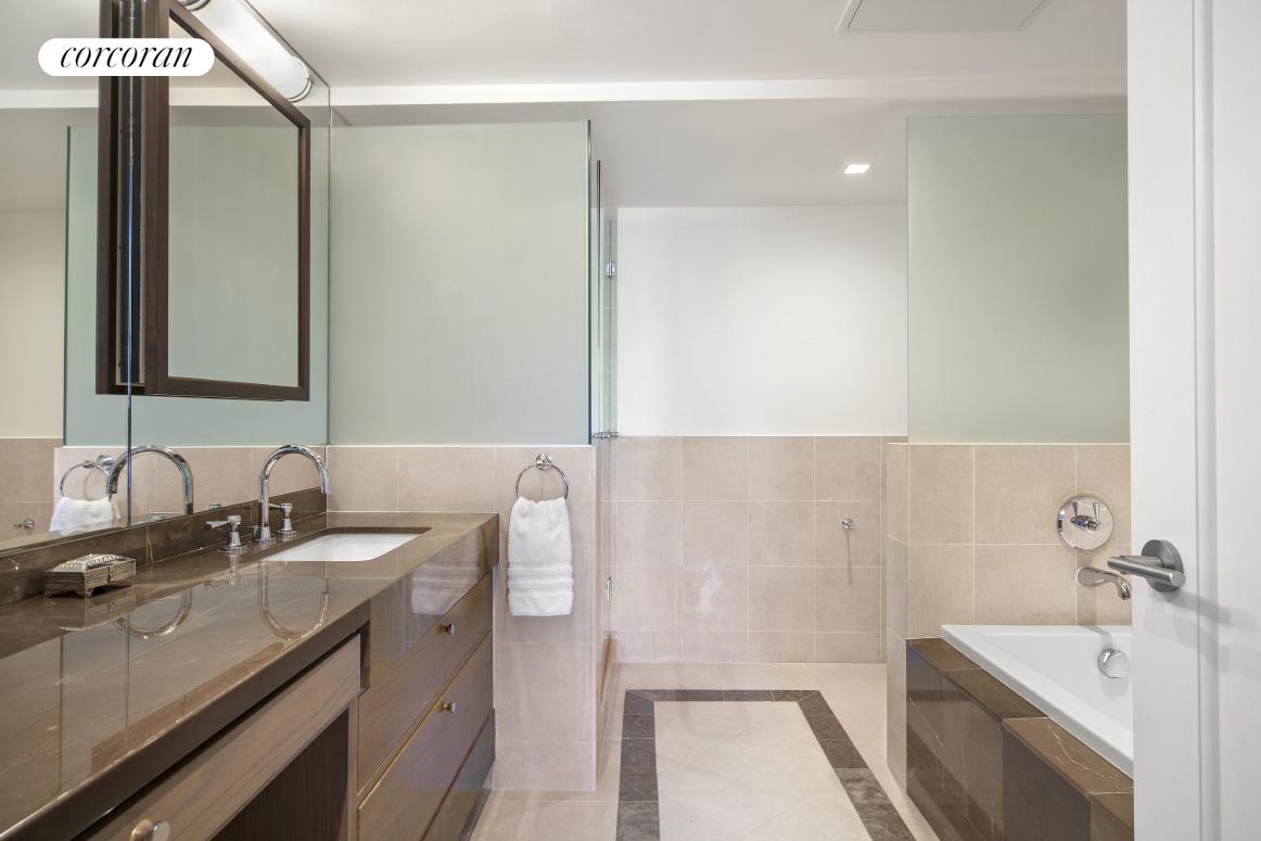 Flanking the kitchen, are the third bedroom which can also serve as a den or private dining room, a windowed guest bathroom with large shower and the washer/dryer closet. The immense guest bedroom has a wall of windows, an entire wall dedicated to an office with custom wood paneling, two large closets and a marble en-suite bath. There are three separate central air zones and multiple additional large walk-in and storage closets.