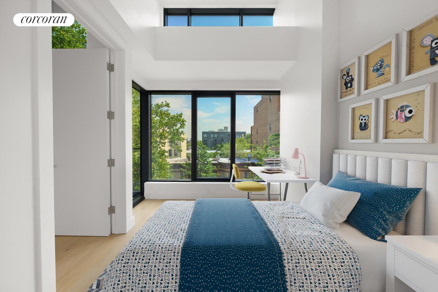 The south bedroom features corner windows and direct terrace access, while the north bedroom offers a spacious closet wall and quiet separation. Two contemporary baths, a walk-in closet, in-unit washer/dryer, and wide-plank oak floors complete this refined residence.