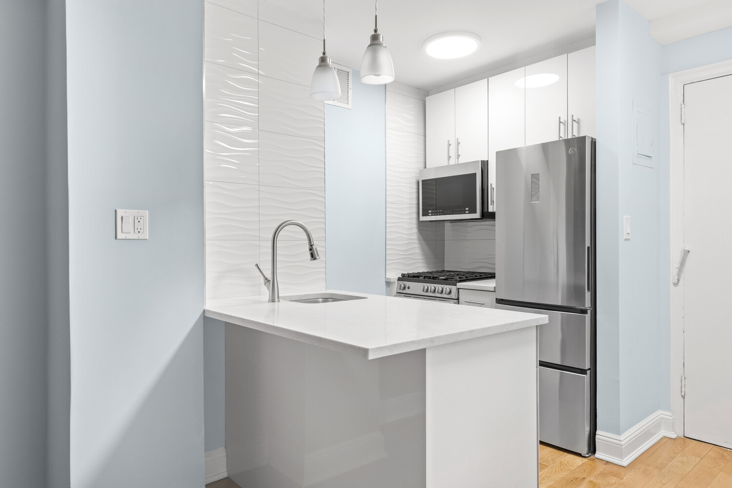 Welcome to this oversized and recently renovated studio at The Broadmoor! The spacious apartment features an open kitchen with quartz countertops, a breakfast bar, white cabinets, full size refrigerator, DW and a built in microwave.