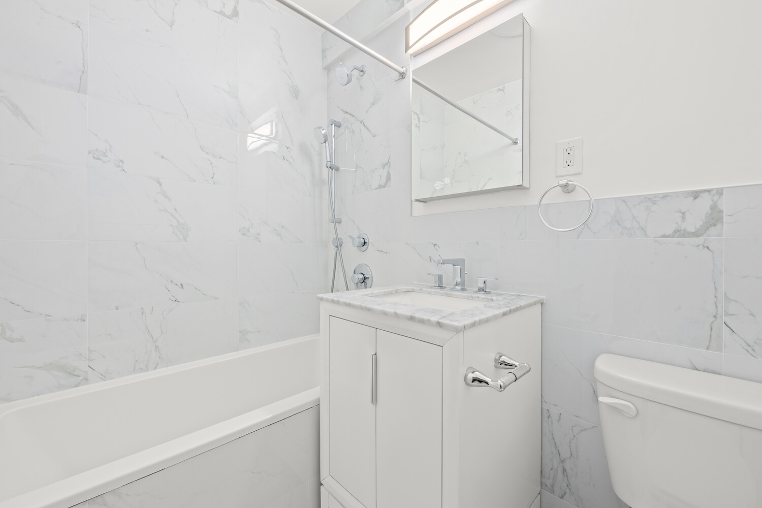 The renovated bathroom with high end finishes and fixtures has ceramic tiles and a deep soaking tub. The apartment has new hardwood floors, new baseboards, wonderful high beamed ceilings and faces the inner courtyard making it a quiet oasis.