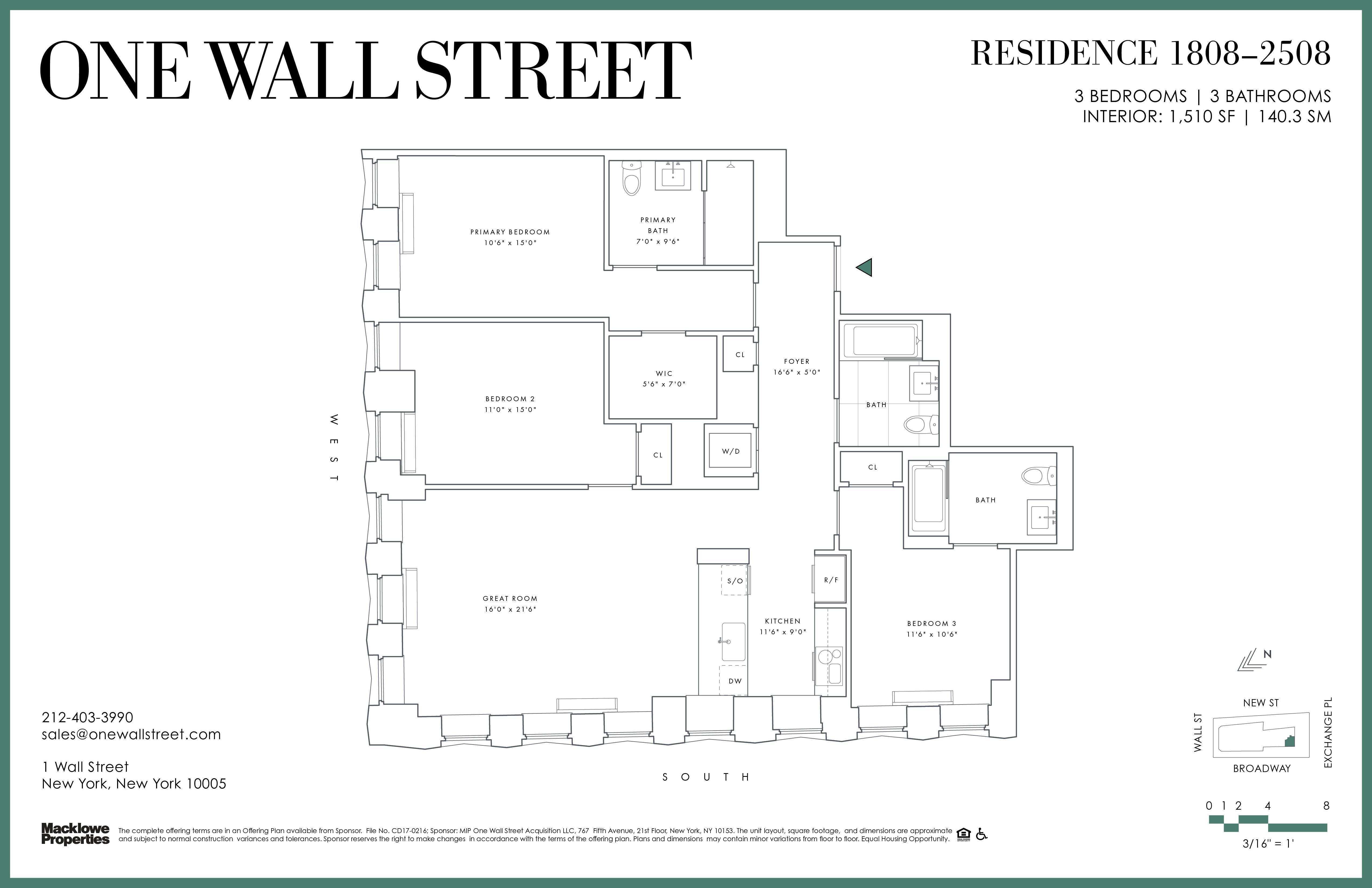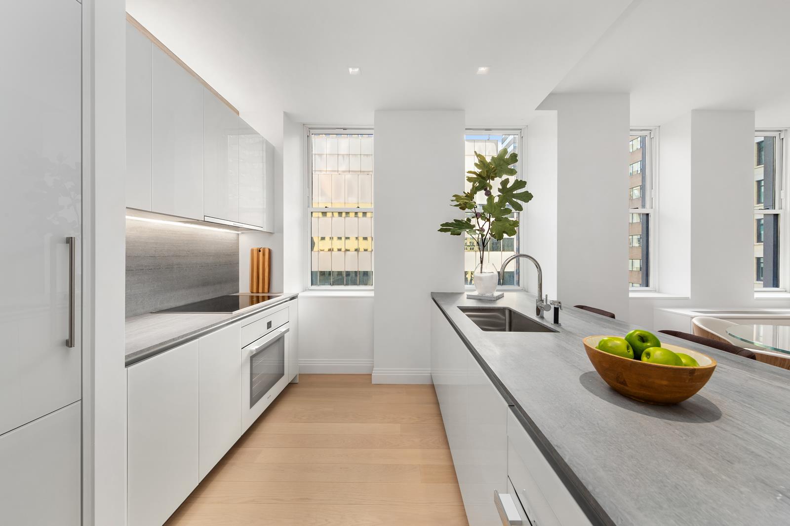 Move In Ready! Residence 2308 is a 1510 SF, three bedroom, three bathroom apartment within One Wall Street. Located on the South, West Corner of the building, this home offers natural light, and ample closet space. Custom kitchens and baths pair seamless technology with classic elegance. The Kitchen features Oceanwood marble slabs which rests on custom Aran Cucine cabinetry, accented by white glass panels and satin nickel finishes and is the perfect blend of beauty and function.
