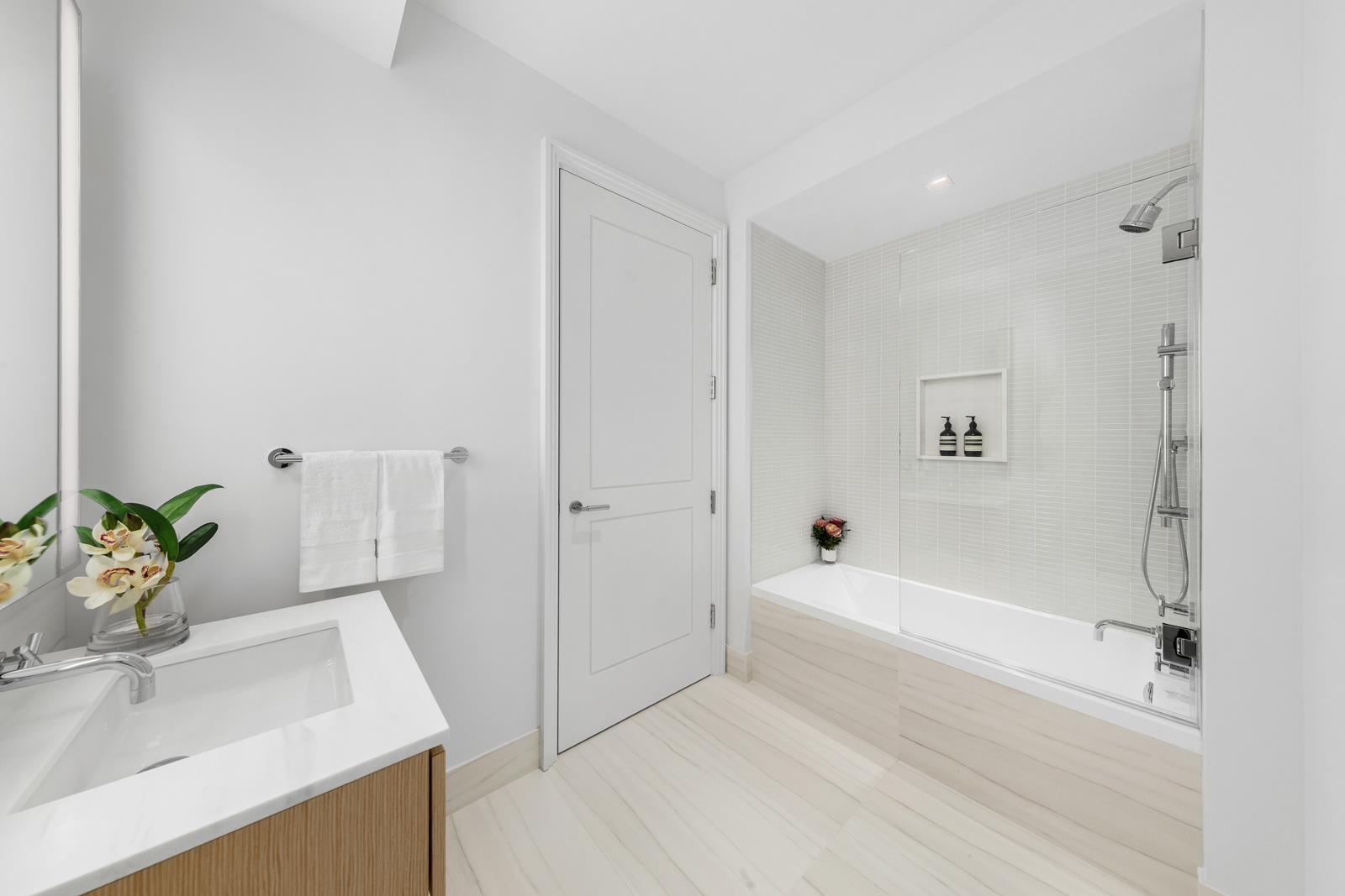 Warm stone primary bathrooms feature stall showers with thermostatic controls. Mirrored medicine cabinets are integrated with LED lighting and Bianco Dolomite marble surround. The building’s one-of-a-kind residences maintain the integrity and character of the 1930s scale, a modern take to art deco detailing, and boast ceiling heights over ten feet throughout with wide-plank French Oak hardwood floors underfoot.
