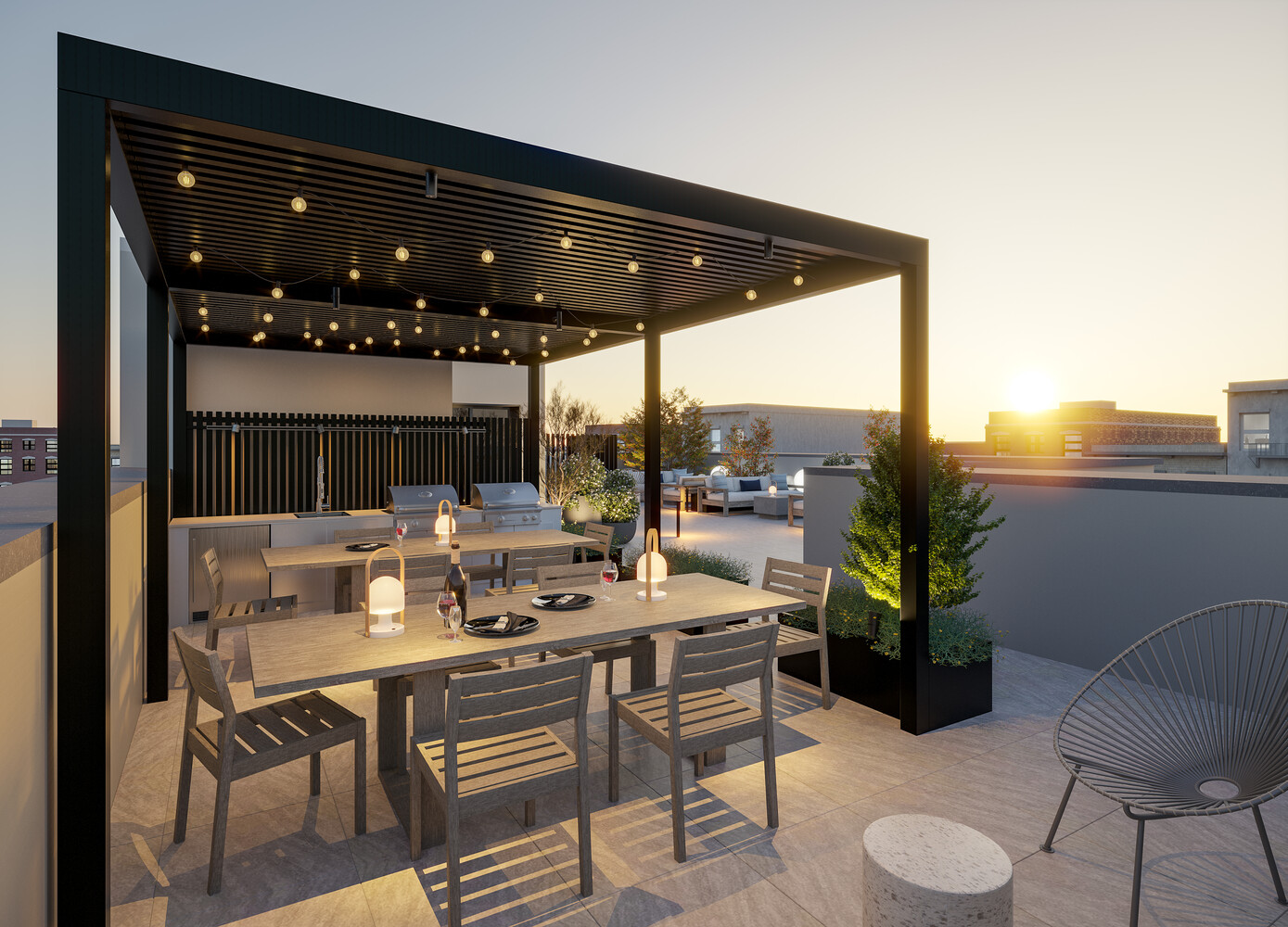 Residents enjoy modern amenities including a state-of-the-art fitness center, a furnished roof deck, and secure parcel lockers. Bicycle stations, storage, and parking are also available for a separate fee.
