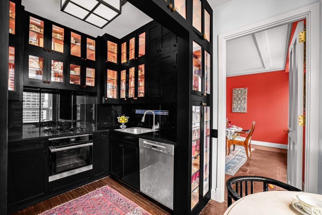 North of the living room, an ample, soundproofed dining room holds the city in constant, shifting view. Candlelit dinners, lively gatherings, and celebrations all find a natural stage here. Custom overhead lighting enhances artwork and allows the mood to be tailored to the moment. The windowed eat-in kitchen pairs chic black lacquered cabinetry with ample storage and space for morning coffee beside the sunrise.