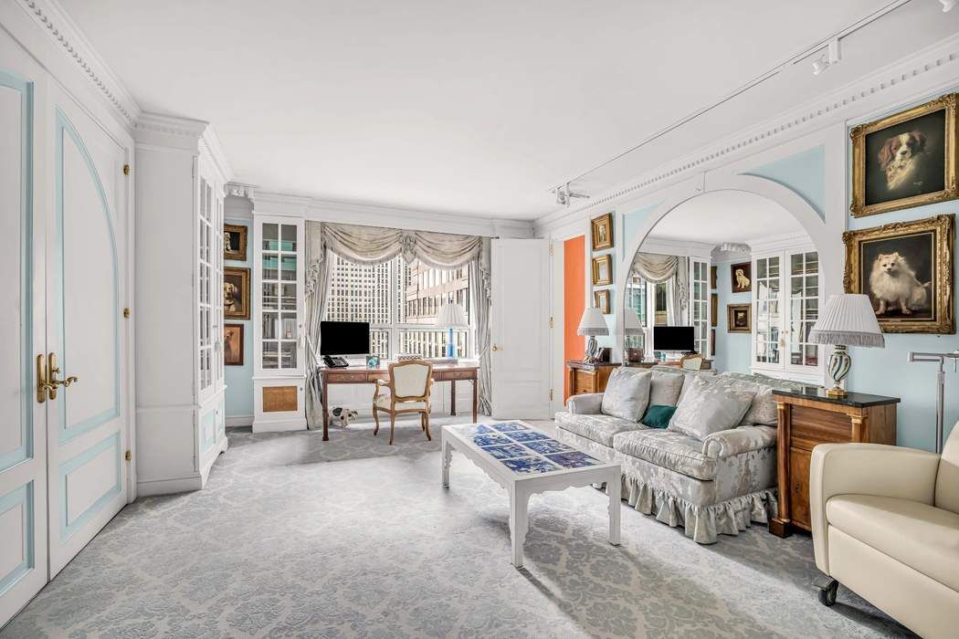 Mirrored French doors lead to the “Gustavian” room, a library and office distinguished by arched doors, southern light, and a tranquil palette of soft blues. Outfitted with discreet storage closets and an ensuite bath, it offers a rare view of the Rockefeller Center Christmas tree in winter.