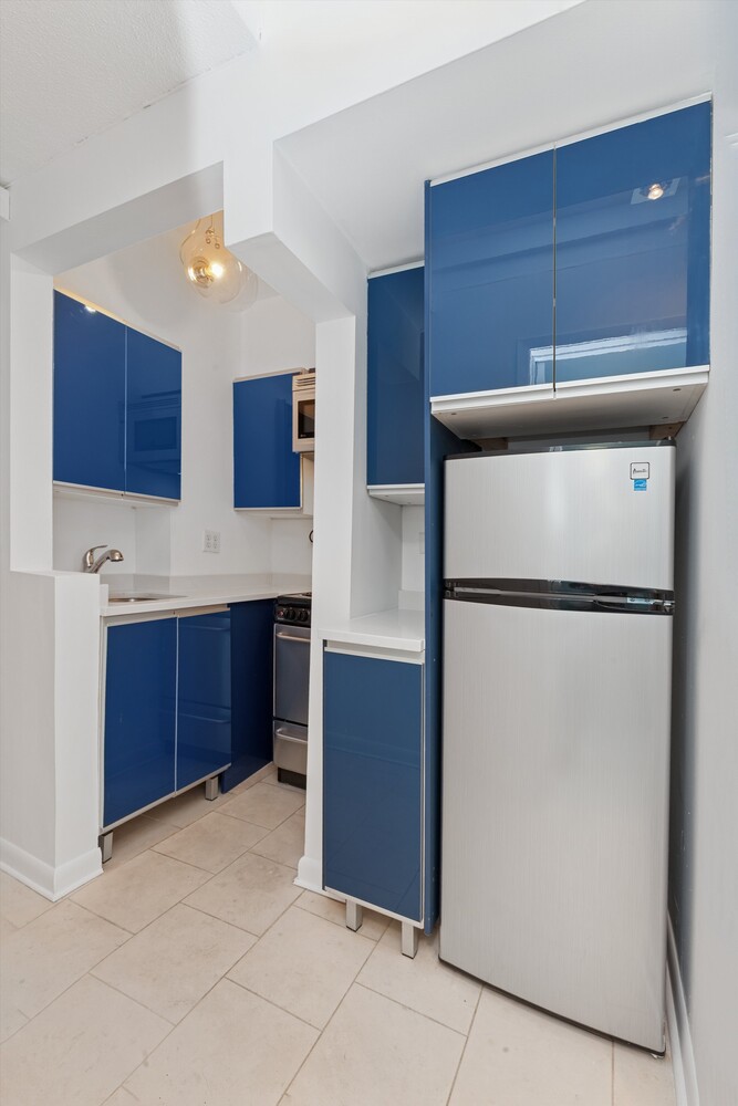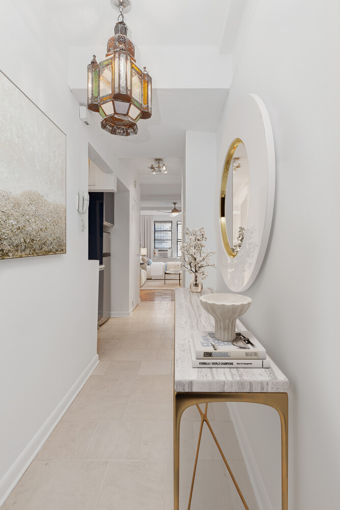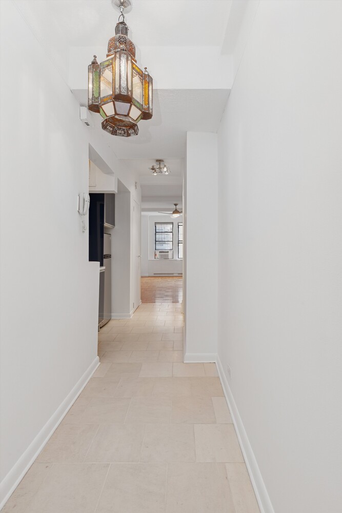 Welcome to Apartment 704, a prewar studio with high ceilings and southern exposure in a luxury coop just minutes from Central Park. Not since 2023 has a studio been available for sale in the building. Enter to a bright charming foyer with just enough space for a table to drop your keys and know you are home. The prewar detail of casement windows and almost 9 foot ceilings beckon you into the generous living space.  With kitchen and bath off the hall, you have a spacious  living room that can easily accommodate a queen bed, dresser, desk, couch, and dining table in any configuration you wish. Views are south over West 73rd street. The kitchen offers full size, stainless steel appliances and brand new quartz counters. The generous bath has blue mosaic tile and a cast iron tub. This property offers an A+ location and the flexibility to be your primary residence or your hotel room in the city.