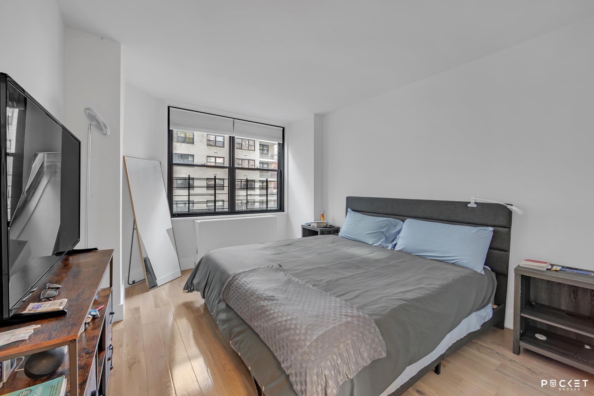 The apartment faces south and gets excellent light throughout the day. The master bedroom is large and houses a king size bed plus full bedroom furniture. Closet space is excellent throughout the apartment.