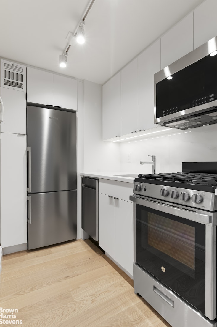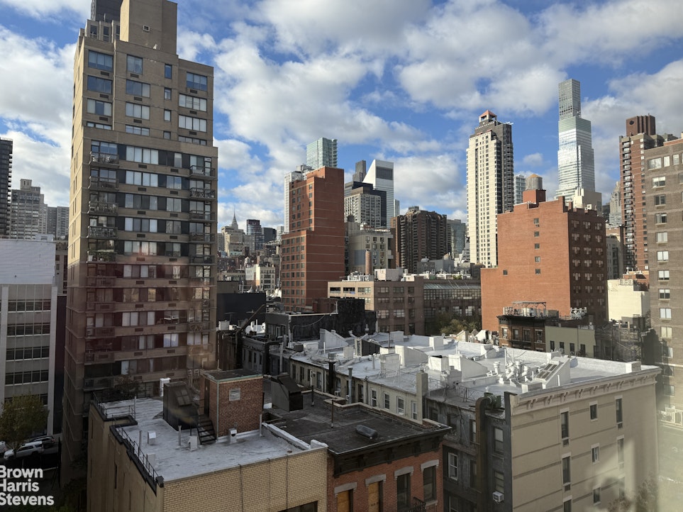 Perched on the 10th floor of 405 East 63rd Street, this sun-drenched, south-facing studio has been meticulously gut-renovated to combine modern elegance with everyday comfort. The expansive living area, featuring three north-facing windows, offers flexible space to create distinct sleeping, living, and dining zones. The chef-inspired kitchen showcases Catalina White Gloss cabinetry, Caesarstone Blizzard Quartz countertops, a polished chrome Grohe faucet, and sleek black hardware. Premium appliances-including a Blomberg refrigerator and GE Profile range, microwave, and dishwasher-add both sophistication and convenience.