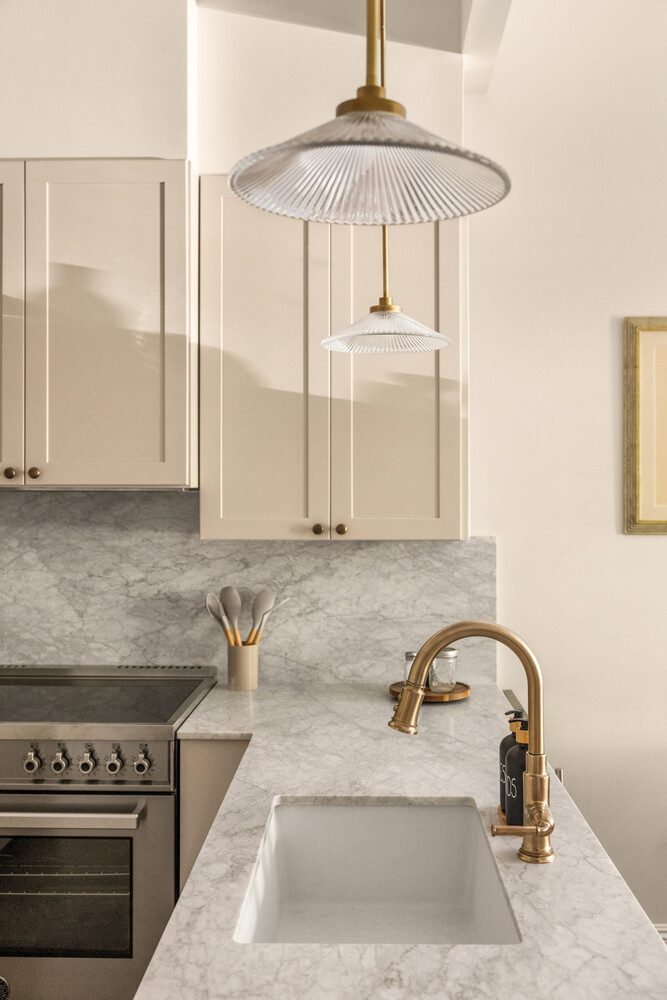 At the heart of Residence Three is a chef's kitchen designed to perform beautifully while making a striking visual statement. Outfitted with a curated suite of premium appliances-including a Fisher & Paykel French-door refrigerator, Bertazzoni induction range, and Bosch dishwasher-the kitchen offers efficiency and durability for the modern home cook. A Blanco undermount sink with Brizo Luxe Gold fixtures brings refinement to daily routines, while custom cabinetry provides generous storage with clean, architectural lines. Calcutta marble countertops and backsplash serve as both a practical workspace and sculptural centerpiece, elevating the kitchen into a true gathering place.