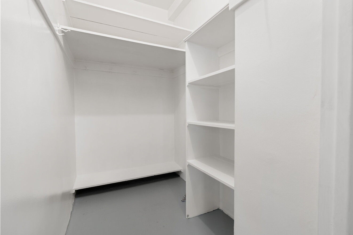 The apartment features refinished original hardwood floors, a generous living and sleeping area, and space for a desk. Additional features are ample storage, including a large walk-in closet within a separate dressing area. Maintenance includes heat and hot water.